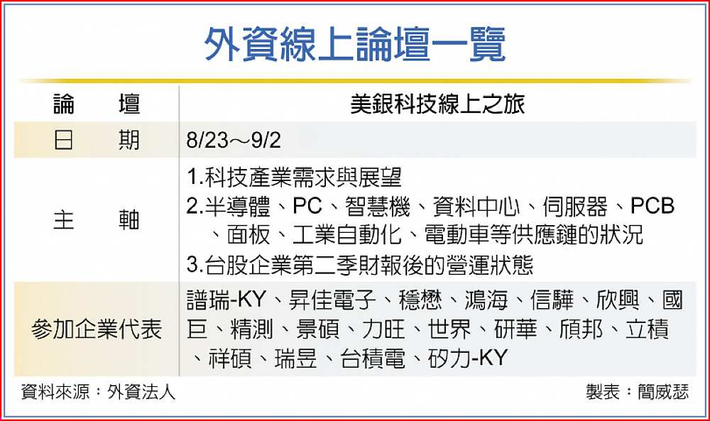 台股波段急挫近一成、各指標股跌勢比大盤更猛烈,外資論壇攜手台股企業緊急信心喊話,高盛台灣線上半導體論壇甫結束,美銀證券緊接於23日展開台灣科技產業線上之旅(Taiwan Tech Tour),邀集18家台股企業與機構法人對談,揭露營運前景,挽回資金信心。
