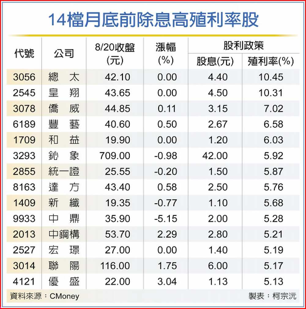 篩選8月底前除息,殖利率大於5%且今年前7個月營收維持成長態勢的個股,包含總太、皇翔、僑威、豐藝、和益、鈊象、統一證、達方、新纖、中鼎、中鋼構、宏璟、聯陽、優盛等14檔熱門股票都有機會上演除息行情秀。