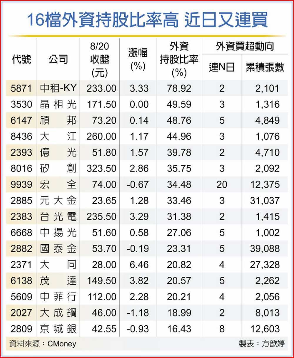不過,盤面上有包括中租-KY、晶相光、頎邦、大江、億光、矽創、宏全、元大金、台光電、中揚光、國泰金、大同、茂達、中菲行、大成鋼、京城銀等16檔,外資持股比率反而增加,且近日連續買超,顯得特別。