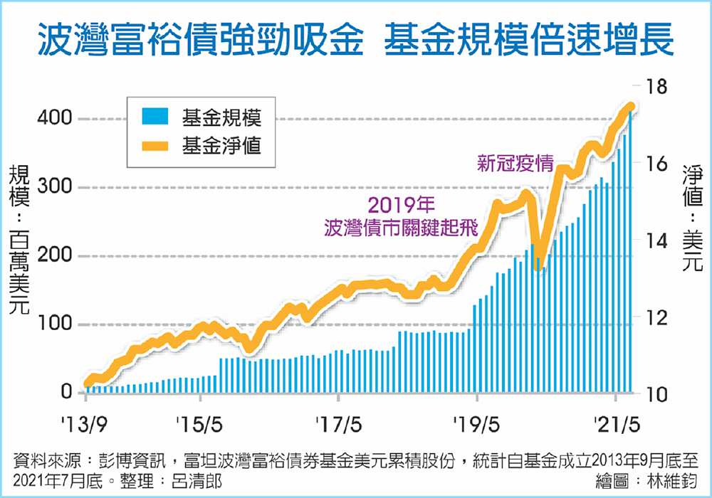 富坦波灣富裕債基金主要投資於波灣六國發行之美元計價政府債及公司債,此區域為產油富裕國度,投資其發行的債券就像是借錢給有錢人,擁有穩健高債信作擔保基礎。近年隨著六國政府相繼推出願景計畫,增加能源以外新財政收入,轉型過程中,提供政府和企業融資管道的債券市場順勢成長茁壯,躍升債市投資新寵。