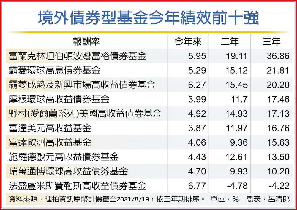 8月全球股市震盪加劇,凸顯債券穩健防禦優勢,根據理柏統計所有境外債券型基金今年來報酬前十強,「富蘭克林坦伯頓波灣富裕債券基金」以漲幅近6%表現領先,累積過去三年亦有近37%的優異績效。
