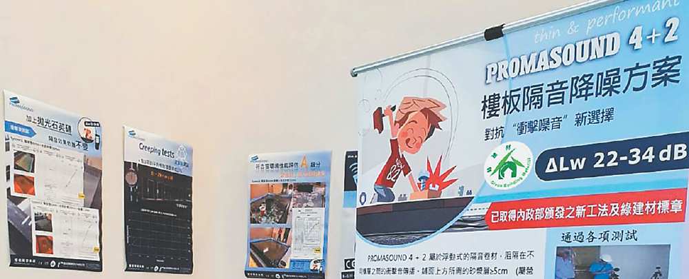 普渼登實業總經理何靜宜指出,今年起台灣分戶樓板隔音法規已正式實施,而公司自比利時所引進的PROMASOUND 4+2隔音材遠高於台灣法規要求的17分貝,經CNS檢測,衝擊音降噪Lw=22dB,並持續提升效能,預計10月可以達Lw=26dB。