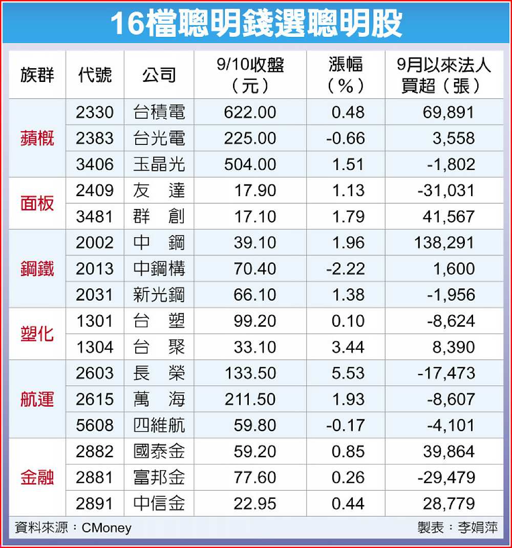 美國10年期公債殖利率維持在1.3%,股市仍是熱錢最佳去處,台股本周小跌42點,跌幅0.24%,但仍有高達524檔個股打敗大盤,顯示資金會流向進可攻退可守的標的。法人以基本面及技術面篩選出16檔聰明股,包括蘋果新機上市帶動台積電、台光電及玉晶光等蘋概股業績升溫;股價跌深或經一段時間整理後重啟漲勢的面板雙雄友達、群創;鋼鐵股中鋼、中鋼構、新光鋼;塑化股台塑、台聚,以及航運股長榮、萬海、四維航等,可望吸引資金進駐。
