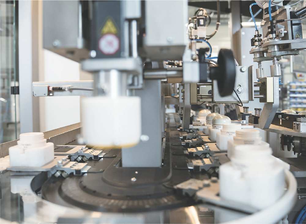 為了適應資生堂廣泛的產品組合,資生堂的機器製造商Unista 使用了一台軌道長度為4米的倍福XTS,其使機器占的地面積縮小。而運輸解決方案由兩個6軸機器人來處理產品;第一個機器人負責裝卸。它將裝滿的化妝品罐放在XTS輸送系統上,該系統使用11個動子將它們運送到相應的加工站;第二個機器人將蓋子放在容器上,並在容器以特定的旋轉角度在下個處理站完全關閉之前輕輕旋入。在最後的品質控制站,容器被分類為合格與不合格組別。其中一項關鍵要求是保護高價值化妝品容器免受任何形式的損壞,以確保包裝的產品符合資生堂品牌的高品質標準。
