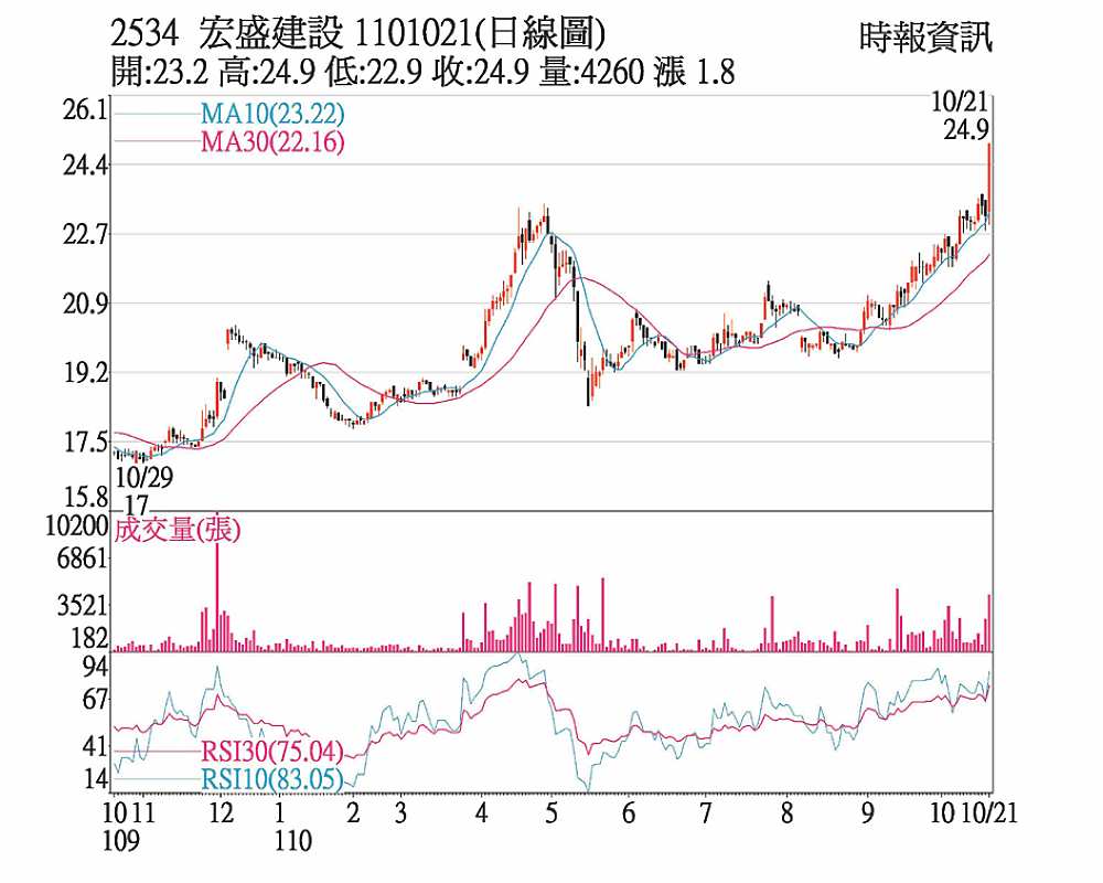 宏盛(2534)醞釀推出新案新店「宏盛心中央」未演先轟動,21日股價尾盤急拉,上演價量齊揚的大漲走勢,終場上漲1.8元、以24.9元作收,漲幅7.79%,成交量4,155張。以技術面看,股價自9月起開始沿5日線一路緩步向上攻堅,21日帶量拉長紅棒,多方有發動攻勢企圖,目前呈多頭格局,有機會震盪走高。