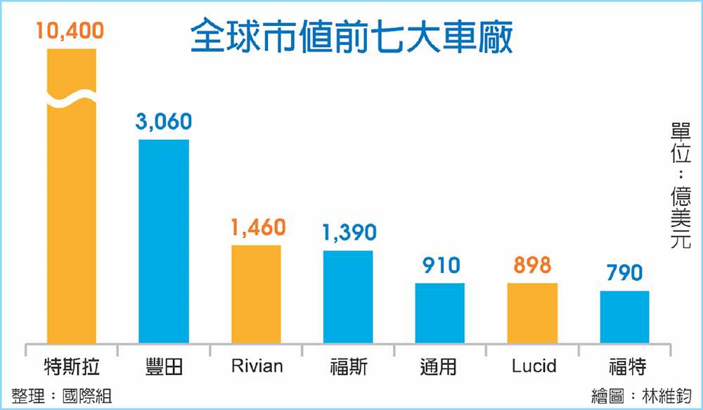 受惠於電動車趨勢崛起,投資人大舉押注相關新創公司,令Rivian與Lucid市值迅速攀升,超越福特在內的傳統車廠,躍居全球第三與第六大。再加上穩坐全球最大車商寶座、市值持續創高的特斯拉(Tesla),電動車三雄(E3)正式成軍。