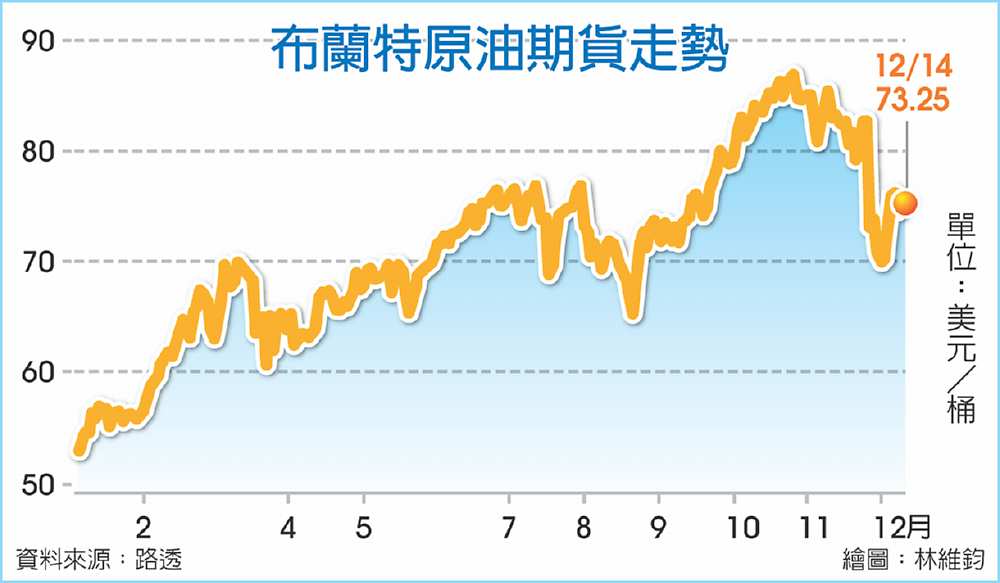 受到IEA調降原油需求預測影響,國際油價14日震盪走低,布蘭特2月期油盤中下滑1.5%,報每桶73.25美元;美國西德州1月期油下跌1.6%,一度失守70美元大關。