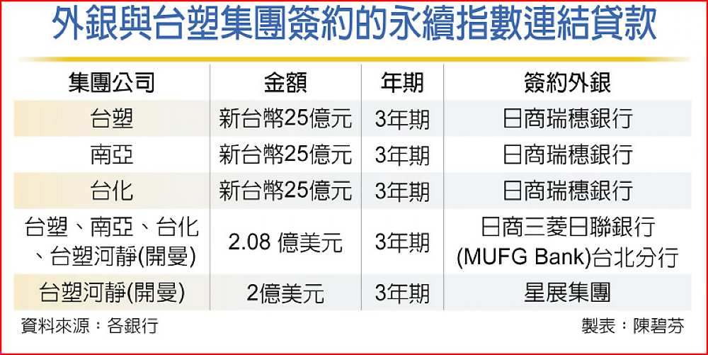 兩大日系銀行瑞穗銀行、日商三菱日聯銀行21日公布,台灣市場出現首宗日系銀行承辦台灣石化業龍頭台塑集團的永續發展連結型貸款(Sustainability Linked Loan, SLL)案例。日商瑞穗銀行攜手台塑、南亞、台化3家公司,共同簽訂新台幣75億元的3年期SLL;日商三菱日聯銀行(MUFG Bank)台北分行則與台塑、南亞、台化、台塑河靜(開曼)等四家台塑關係企業,簽署合計2.08億美元、約新台幣60億元的SLL。