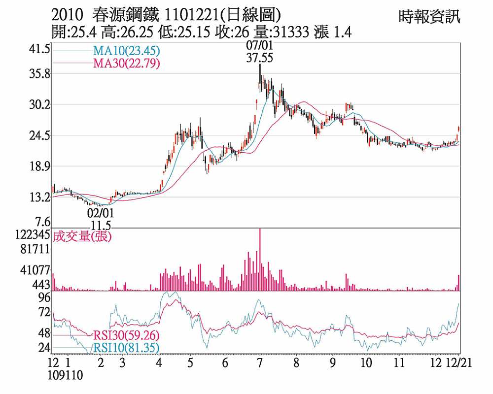 春源(2010)受惠於營建、與公共工程等鋼構需求暢旺,2021年業績亮麗,21日股價開高震盪走高,終場大漲1.4元,收在26元、漲幅5.69%,爆出31,297張交易鉅量。就技術面看,該股20日站上季線後,21日持續放量攻堅,多方企圖心強,若能守穩24.5元,將有利股價向上續攻。
