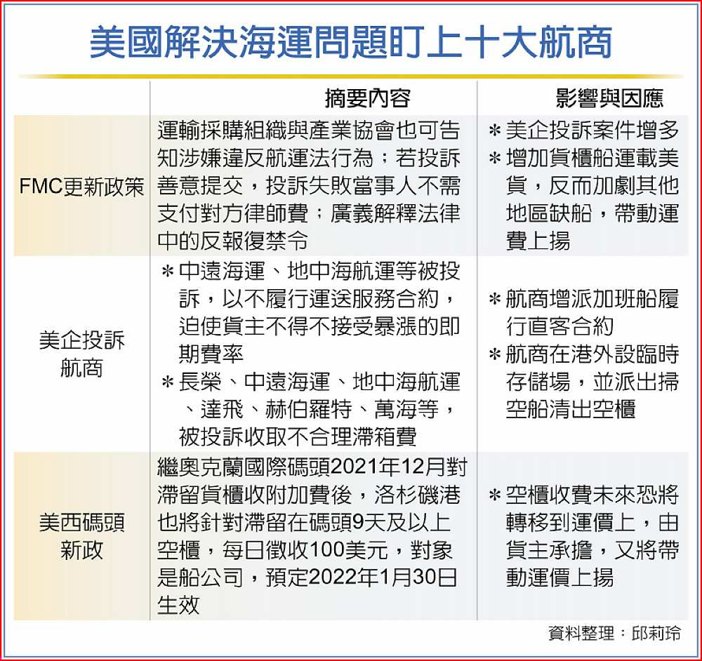 貨櫃高運價讓貨主壓力飆,加上美國FMC(聯邦海事委員會)更新政策,有利貨主對船公司投訴,傳出投訴案件增多,最新一起是FMC在2021年12月30日公告將調查萬海收取「不合理」滯箱費。