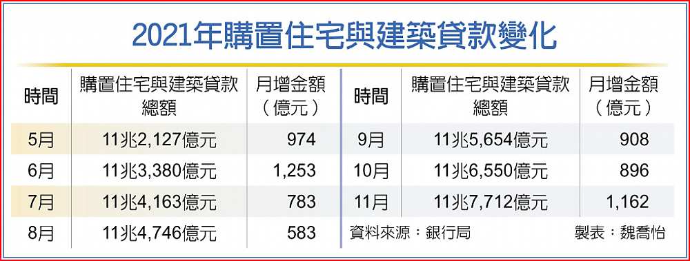 檢視金管會、央行2021年三波打炒房措施,上半年略見成效,然下半年放款增速又再起。據銀行局統計至2021年11月底,2021年前11月的購置住宅貸款與建築貸款總餘額達9,626億元、年增率8.9%,不管是放款總額還是年增率都較2020年前11月的8,618億元、8.8%高,增速並未放緩。