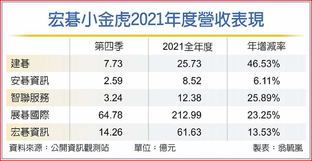 宏碁集團旗下小金虎2021年度交出營收齊揚的表現。其中,營運動能自2021年第二季起加速回溫的建碁(3046),在新訂單、新專案加持下,全年營收年增逾46%、站上近13年來新高。另包括安碁資訊(6690)、智聯服務(6751)、展碁國際(6776)及宏碁資訊(6811)等,年營收也都有刷新IPO以來歷史新高的表現。