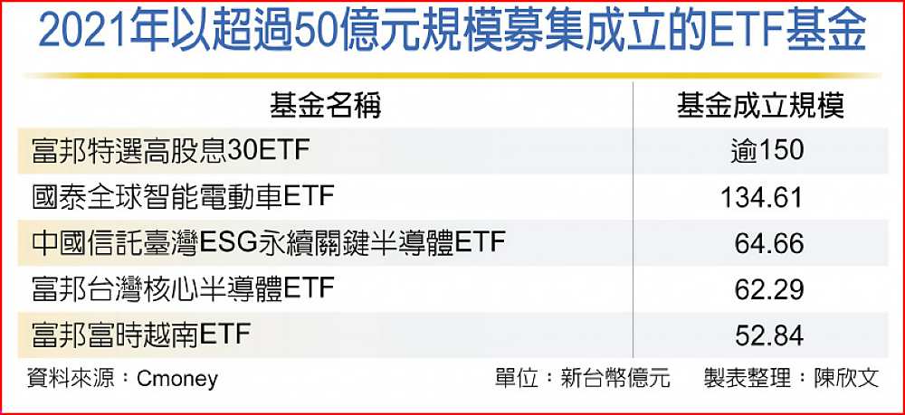 據統計,2021年19檔ETF成軍,以當時新基金募集成立時的金額來看,募集就吸引超過50億元以上的共計5檔,分別為富邦特選高股息30、國泰全球智能電動車、中國信託臺灣ESG永續關鍵半導體、富邦台灣核心半導體與富邦富時越南等ETF基金,其中高股息與電動車ETF募集吸金超過百億元。從募集熱度可以嗅出,高股息、電動車、半導體等相關題材,最受市場青睞。