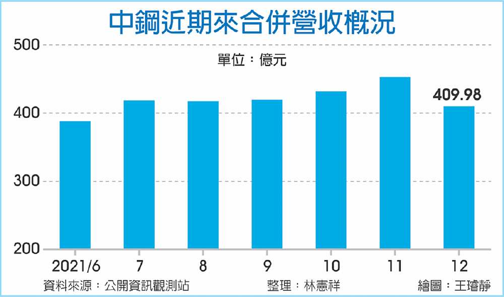 受到塞港出貨減少與下游庫存偏高影響,中鋼2021年12月合併營收月減9.46%,逼近410億元,較2020年同期則大增33.95%,累計2021全年合併營收達4,683.28億元、年增48.78%,仍創歷史新高,且中鋼持續看好春節過後的提貨潮與鋼市前景。