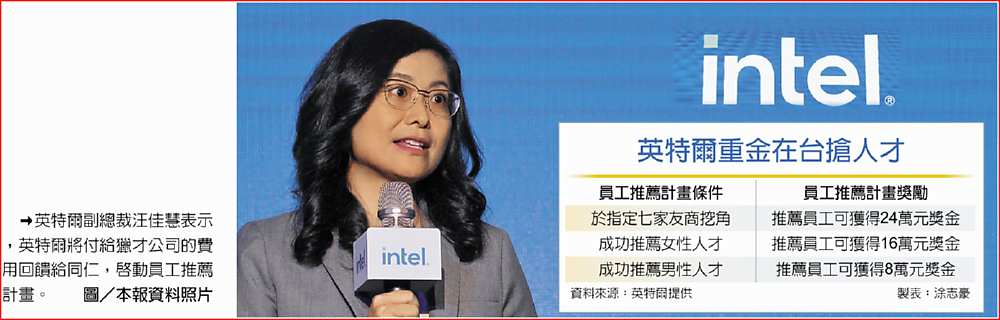 包括台積電、聯電、聯發科等大廠祭出高薪搶人才,英特爾因此在台灣啟動了員工推薦計畫。汪佳慧表示,英特爾相信,了解公司業務與文化的優秀員工,也有機會為組織帶來優秀的人才,所以將付給獵才公司的費用回饋給同仁,英特爾選定特定市場進行最新員工推薦計畫,若成功推薦來自業界七家指定友商的好手進入英特爾服務,該員工可獲得最高24萬元的獎金。