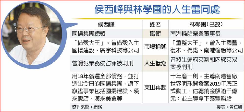 侯西峰過去有「借殼大王」的稱號,他曾借殼入主國揚建設、廣宇科技等公司。林學圃也曾入主國豐、復木、楊鐵、南港輪胎等公司,獲得「重整大王」美譽,兩人發跡過程頗為類似。