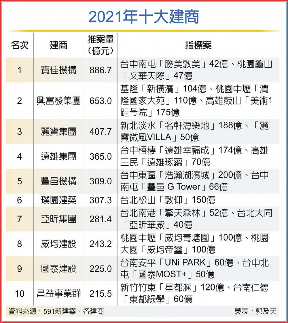 2021年全台十大建商出爐,據591新建案調查顯示,寶佳機構以887億元的推案量蟬聯「推案王」,二至五名分別為興富發、麗寶、遠雄、豐邑等,亦是連續多年入榜的常客,推案量均在300億元以上。至於鎖定桃園推案的威均、由新竹跨足台南的昌益,均挾大案推出,各以243億、216億元,擠入全台十大建商。