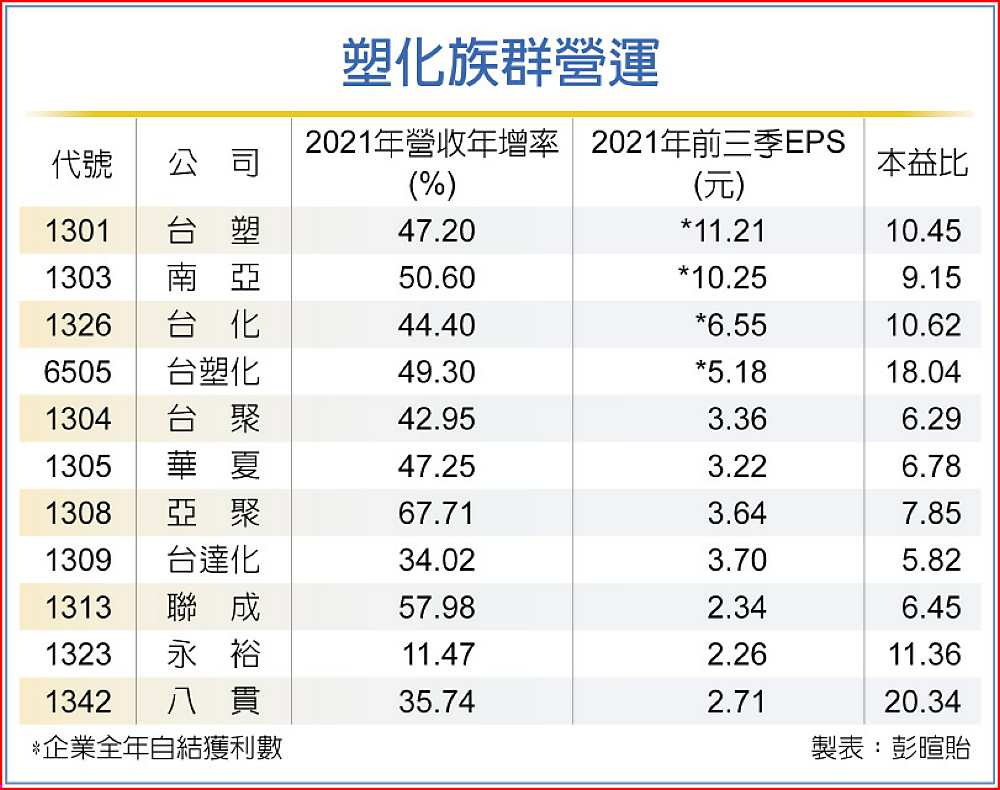 油價彈升80美元之上,塑化報價回穩走堅,EVA更出現止跌反彈80美元、每噸報價重回2,200美元之上,達到2,275美元。伴隨油價走揚、報價持穩,以及2021年獲利大豐收的高股息題材,催化台塑四寶、台聚集團、聯成,及永裕、八貫等成為族群攻堅指標。
