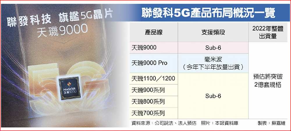 聯發科2022年出貨成長的主要產品線在於,天璣9000及下半年將搭載終端裝置問世的毫米波(mmWave)5G旗艦晶片。其中,天璣9000已經獲得OPPO、Vivo及榮耀等手機品牌大廠訂單,且在2021年第四季就已經開始量產出貨,2022年上半年正進入放量生產階段,將替聯發科上半年合併營收及毛利率帶來成長動能。