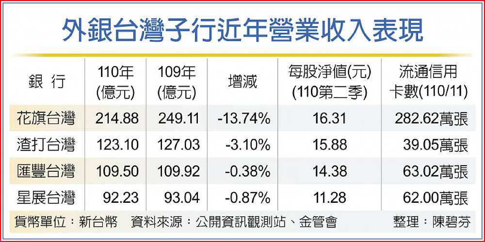 花旗、匯豐、渣打、星展,是四家領有台灣子行銀行執行的外商銀行。從業務收入、稅前盈利等銀行公開財務資料分析,花旗(台灣)銀行的信用卡數、財管客戶貢獻度、營業收入、每股淨值長年領先所有外商銀行,表現績效甚至是數倍之高,如流通信用卡數,花旗有282萬張,匯豐63萬張,星展62萬張,渣打39萬張。星展花旗整併後,如果轉卡順利,星展信用卡數估計約344萬張,等同渣打的近9倍。