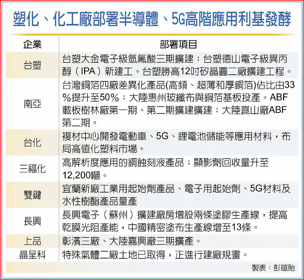 市調機構預估,至2025年總計LTE和5G專網市場規模可逾50億美元,面對全球首波5G專網部署商機發酵,南亞旗下電子材料、DRAM、載板近年持續擴產升級;台塑轉投資半導體特用化學品、矽晶圓等新產營運蓄勢待發,與台化相關應用材料也加速推展,力拚擴大高值化耕耘版圖。