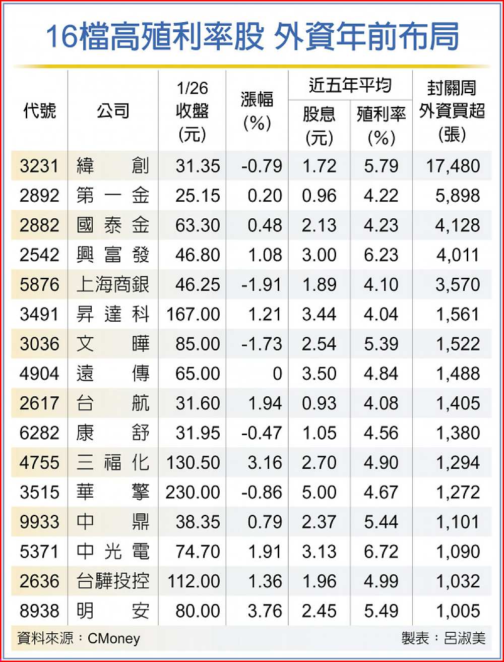 緯創(3231)、第一金(2892)等16檔往年殖利率逾4%,且外資在封關周卡位,成虎年開紅盤「進可攻、退可守」的標的。