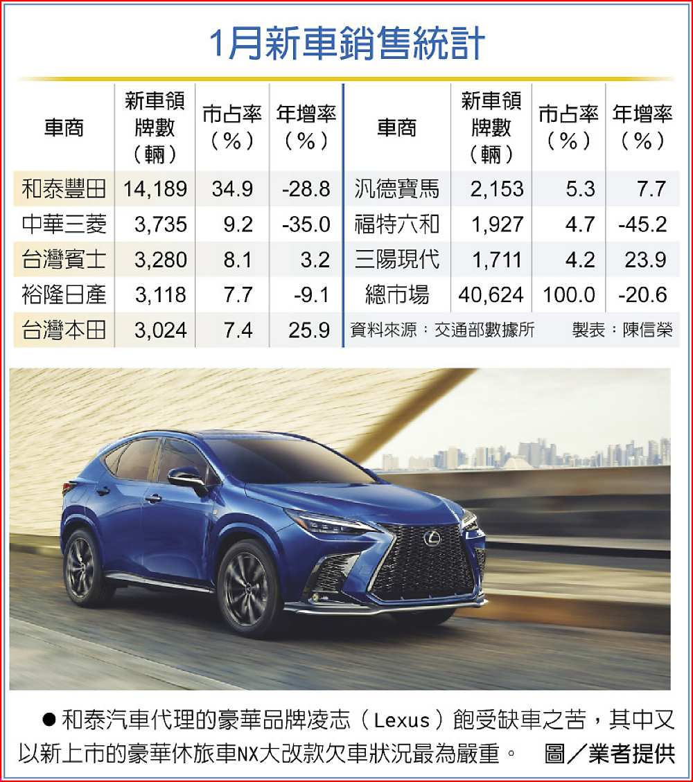 代理豐田與凌志(Lexus)品牌車的和泰汽車,1月以1.42萬輛、市占率近35%的成績,開出2022年業績好彩頭。不過和泰車也是這波缺車問題的大苦主,豪華品牌的凌志1月有多達5,000張的訂單無法交車,六成是剛發表的豪華休旅車NX大改款;包括Camry等豐田品牌的進口車,也有超過3,000張的訂單無法交車。