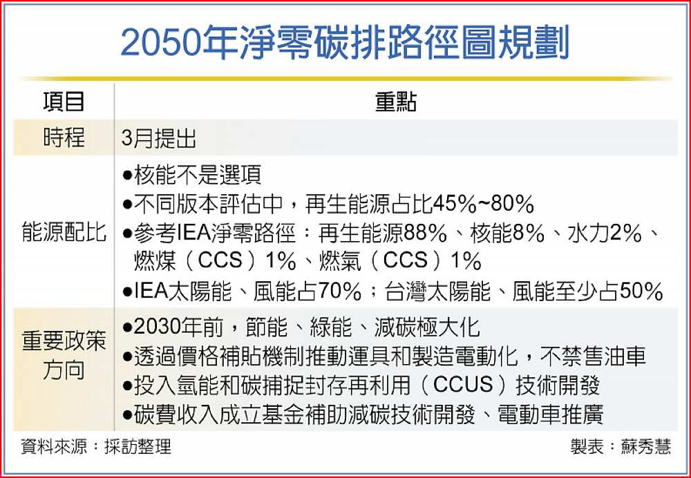 淨零碳排路徑圖將涵蓋四大重要政策方向,一是2030年前,節能、綠能、減碳極大化;二是運具和製造電動化勢在必行;三是確定投入氫能和碳捕捉封存再利用(CCUS)等相關技術開發及合作。