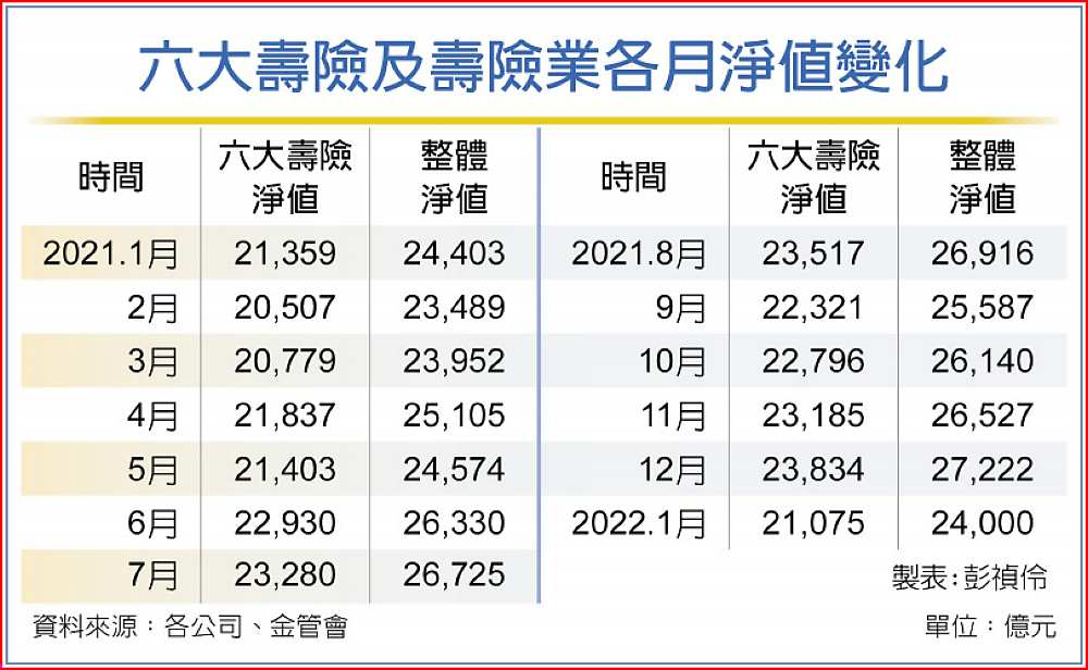 通膨憂慮與地緣政治危機,威力不亞於疫情。六大壽險公司元月雖成功創造開門紅,稅後合計賺逾491億元,還比2021年1月的474億元成長近3.6%,但六家公司淨值元月「蒸發」近2,800億元,僅次2020年3月因新冠肺炎全球蔓延「嚇掉」的4,800多億元。
