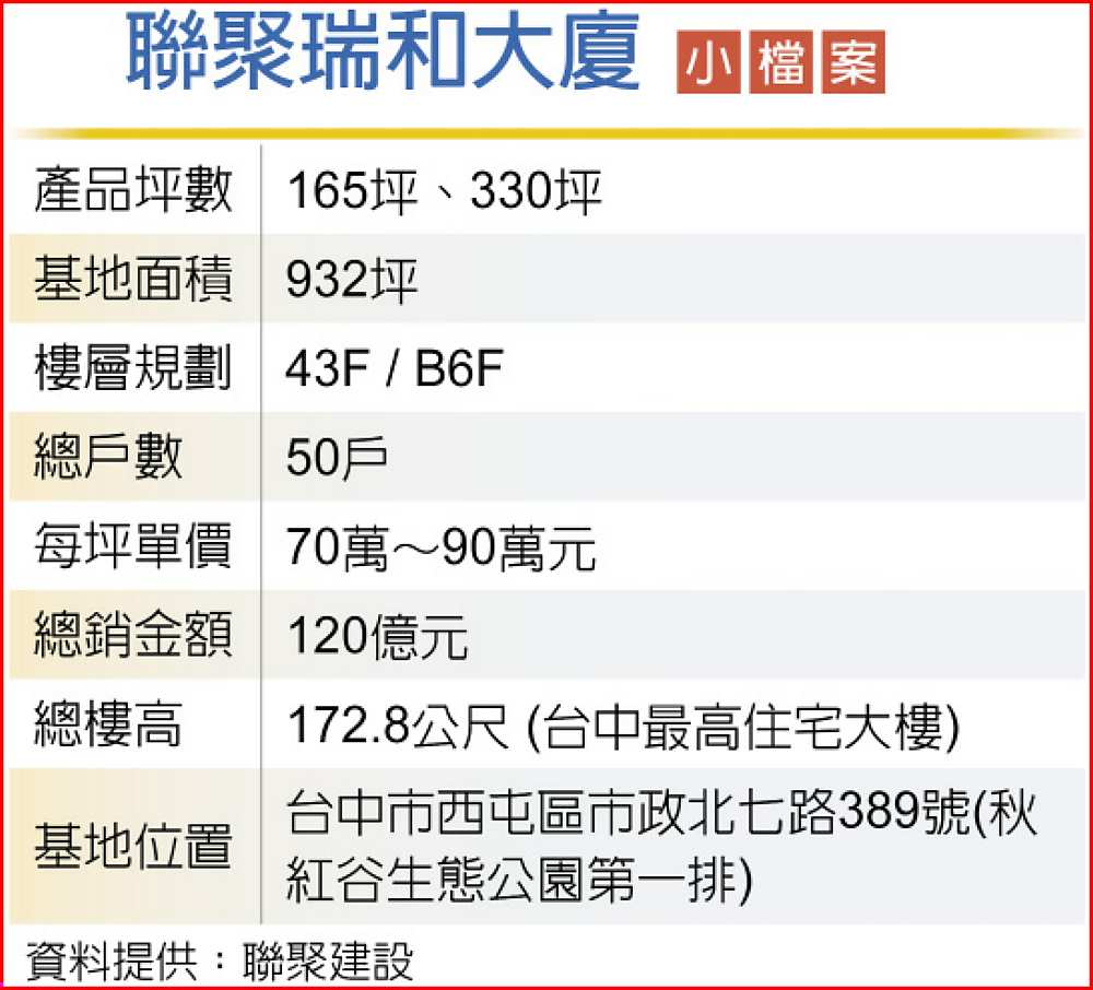 位於秋紅谷生態公園首排的「聯聚瑞和大廈」,面對近萬坪新市政特區中最開闊的公園景觀。王于娟表示,「聯聚瑞和」位處七期核心位置,規劃之初即設定打造「中台灣最高」的住宅大廈,共43層樓高172.8公尺,歷時7年打造。因摩天高樓有許多挑戰和限制,聯聚以建築高度表決心,在各項規格設立「聯聚天花板」,耐震係數達0.409g,高於法規要求42%,種種要求皆是七期標竿。
