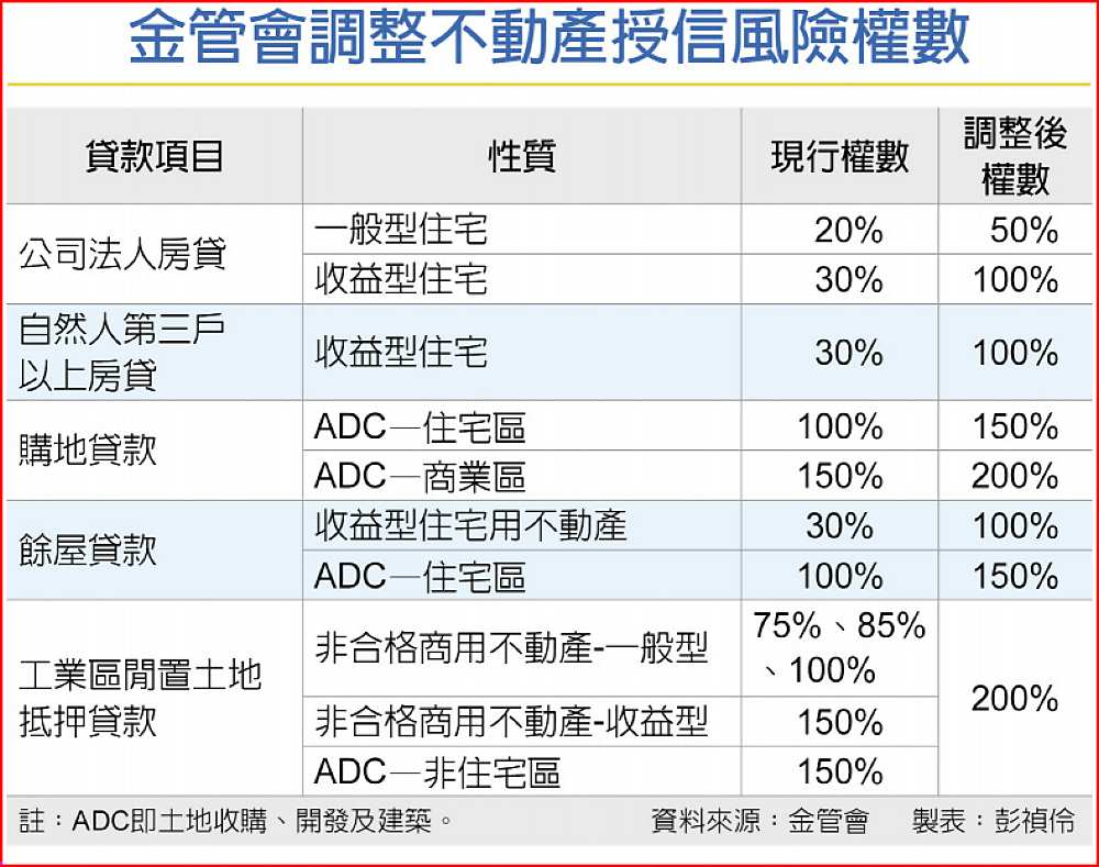 五大貸款部分,第一部分即公司法人一般型房貸風險權數由20%拉高到50%、購置收益型房貸(即投資用)由30%拉高到100%;第二是自然人購置第三戶以上房貸風險權數則由30%拉高到100%。