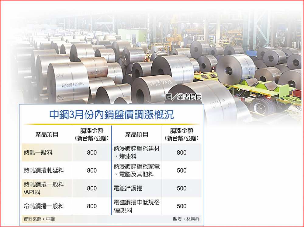 中鋼3月份內銷盤價調漲結果是:熱軋鋼板一般料、熱軋鋼捲軋延料和一般料、冷軋鋼捲一般料、熱浸鍍鋅建材和烤漆料等五項鋼材,每公噸調漲800元;熱浸鍍鋅家電料、電鍍鋅鋼捲及電磁鋼捲中低和高規料,每公噸調漲500元。