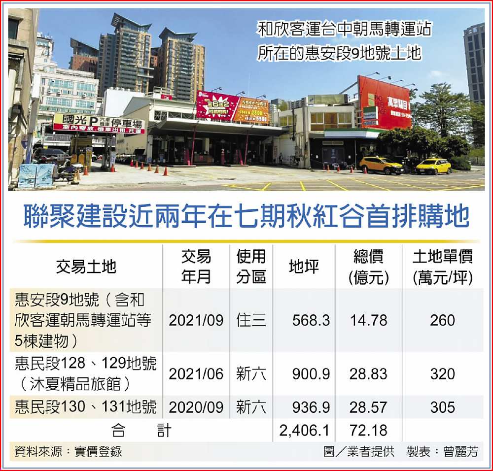 近幾年建商擴大獵地形成風潮,除了摩鐵、夜市、大型餐廳,連占地面積大的轉運站也成了購地的目標!據最新實價揭露,和欣客運台中七期朝馬轉運站所在的「惠安段9地號」房地,去年9月被「台中豪宅一哥」聯聚建設,豪砸14.78億元購入,每坪單價約260萬元。這也是七期首件客運站土地出售案。