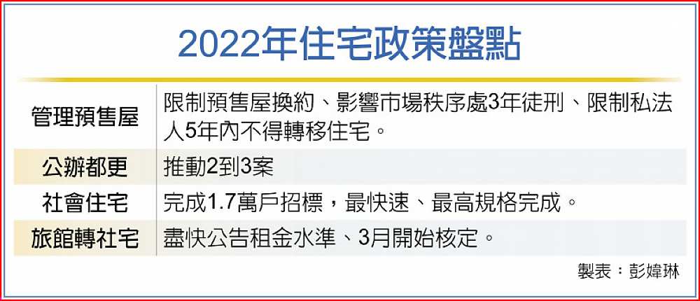 對於2022年房市政策,花敬群表示,社宅興辦從2021年到2022年1月,已經完成1.5萬戶招標,目標2022年完成1.7萬戶招標,用最快速度、最高規格把目標完成。