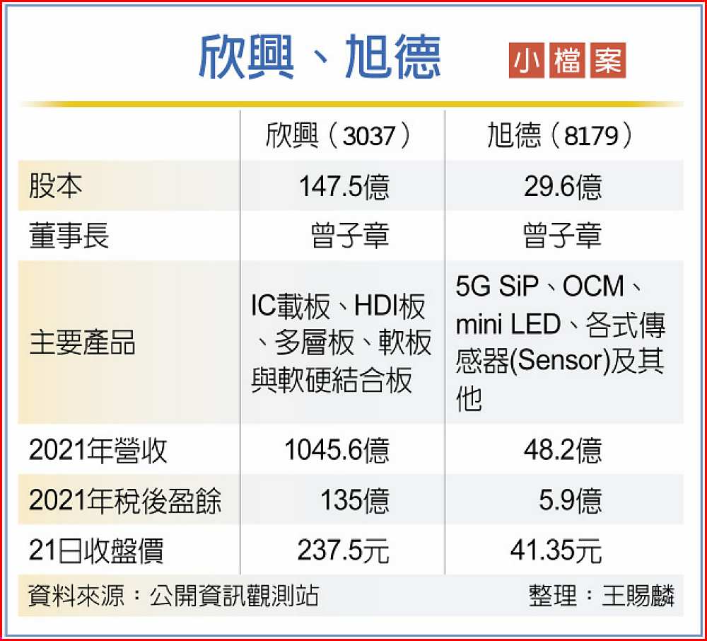 IC載板暨高階印刷電路板廠欣興(3037)與SiP載板專業廠商旭德(8179)22日同步召開董事會通過合併案,暫定1股旭德普通股換發欣興普通股0.219股,預計合併基準日為10月1日,以21日收盤價計算,欣興237.5元,旭德約41元,此收購案溢價幅度達26%以上。