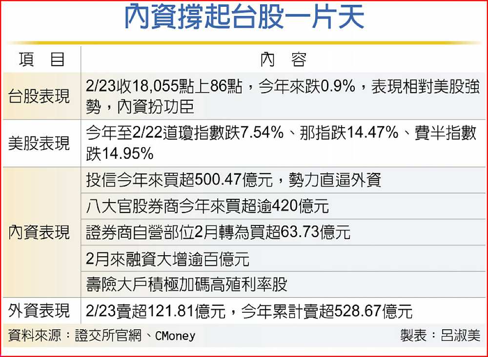 中信投顧總經理陳豊丰及萬寶投顧董事長朱成志均看好台股後市,主因進入2月底、3月以後,上市櫃公司去年財報陸續公布,獲利創新高可期,同時各公司董事會陸續召開,將公布優異股息政策,高殖利率股題材受關注,因而吸引內資大舉進駐,成為台股今年來表現優於美股的重要買盤。