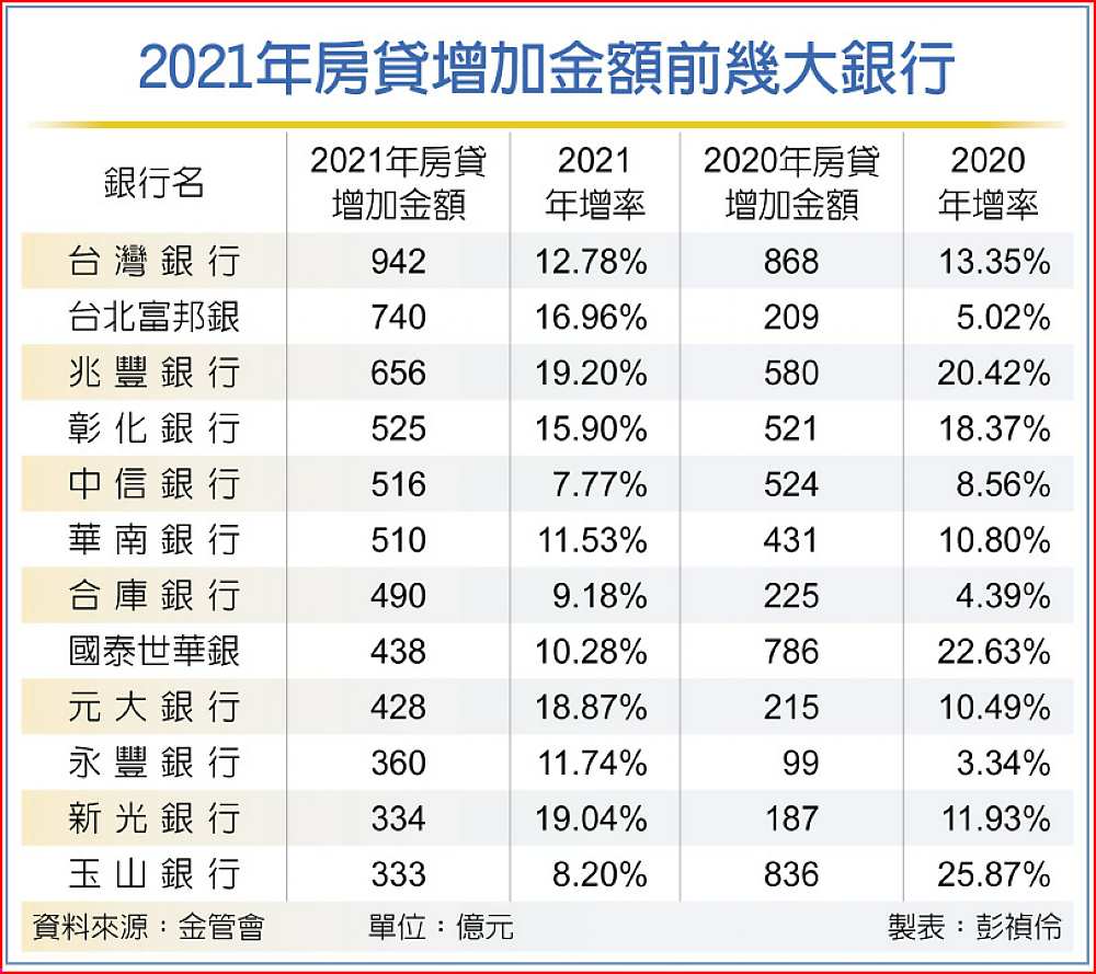 但也有銀行趁機先追趕房貸業務,如台北富邦銀去年增加逾740億元,年增16.69%,遠高於2020年增加209億元、年增5.02%;華南銀則年增近510億元、成長11.53%,比前年的431億年、年增率10.8%略高。