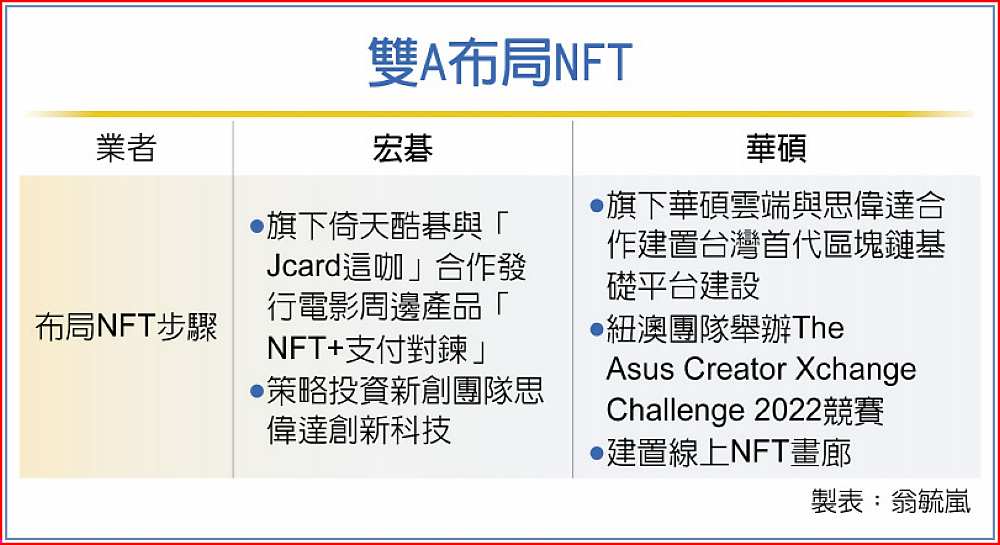 元宇宙正夯,雙A看好未來內容為王的商機,齊跨NFT領域布局。華碩近來積極於紐澳地區擴大推廣旗下創作者ProArt系列產品線,今年初並為此建置線上NFT畫廊,鼓勵創作者投入NFT數位藝術品創作。宏碁則是透過投資新創團隊思偉達創新科技,宣告正式跨入源於區塊鏈技術的NFT發展商品化及數位藝術商機。