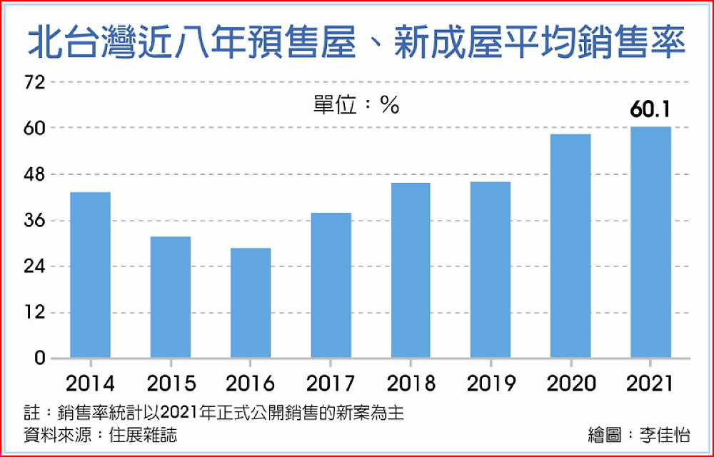 住展雜誌24日最新統計,2021年北台灣新成屋、預售屋市場可售戶數為65,407戶,平均銷售率60.14%。住展雜誌研發長何世昌表示,平均銷售率已連續五年攀升,且處於多空分水嶺的50%之上,顯示市場依然穩健,預估今年銷售率依然可以站穩在五成以上。