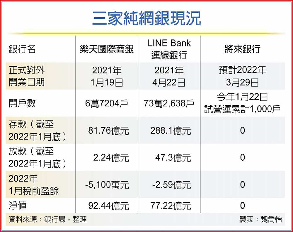 三家純網銀求生存,今年力拚法人、房貸線上業務試辦。已開業的兩家純網銀樂天銀行、LINE Bank,目前都還是呈現虧損狀態,其中LINE Bank今年更恐面臨增資(虧損達資本額三分之一),為突破瓶頸,據了解,三家純網銀已取得共識,並預計在今年向金管會提出「試辦」,首波爭取的業務即「法人」、「房貸」兩大業務。