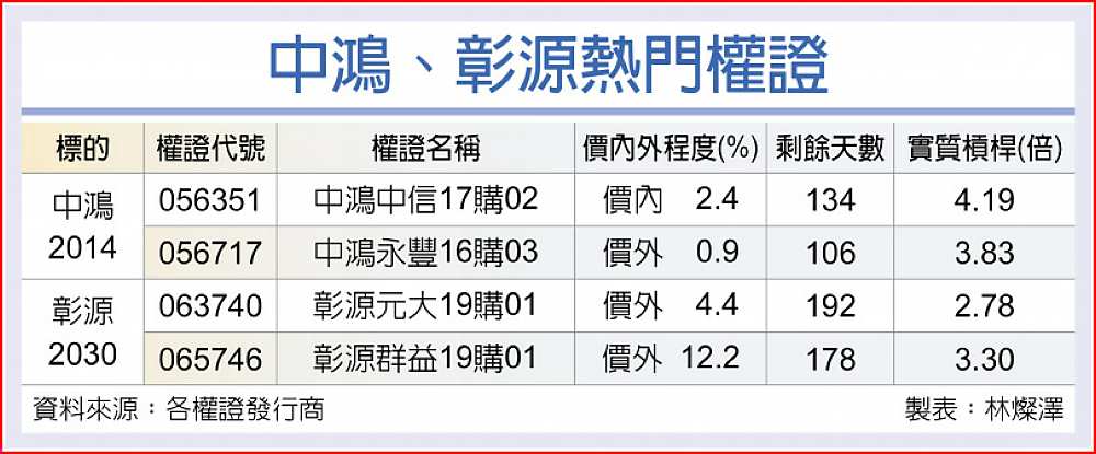 7日台股重挫走勢,指數開低走低收17,178.69點,跌幅達3.15%;鋼鐵族群逆勢上揚,中鴻(2014)、彰源(2030)兩檔鋼鐵股帶量攻堅行情,中鴻股價收高43.9元、大漲4.52%,彰源收盤價34.25元、上揚2.54%,帶動相關認購權證交投活絡。