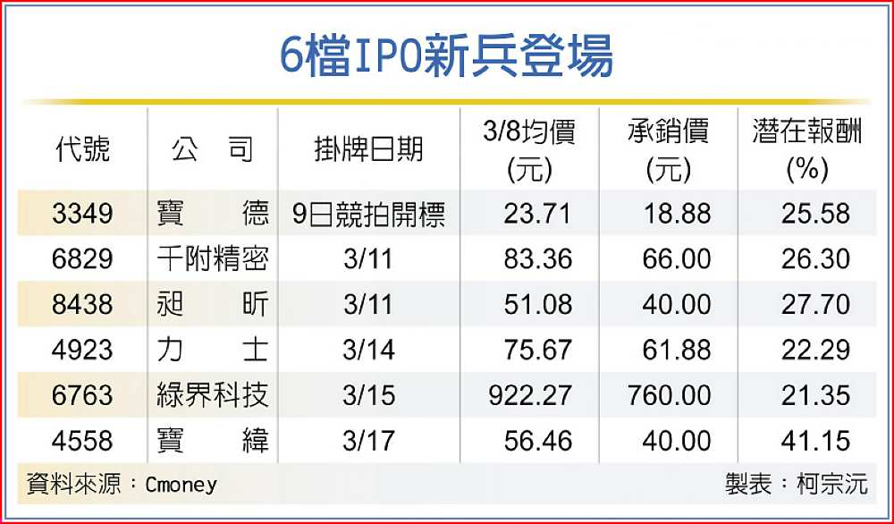 另外目前已進入IPO階段的新股包含昶昕(11日上市)、千附精密(11日上櫃)、力士(14日上櫃)、寶緯(17日上櫃),以及通過主管機關核准等待掛牌的台灣精銳、峰源-KY、來頡、鼎基、晉弘、晶呈科技、明係、信實、美達科技、達航、鈺鎧、濾能、正基等13檔個股。