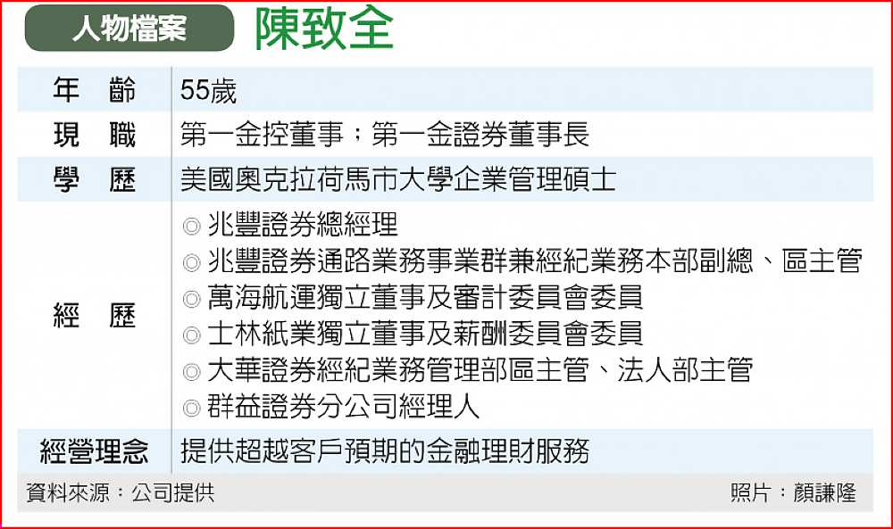 第一金證券董事長陳致全指出,國內券商已進入資訊軍備競賽的時代,他將全力推動公司數位優化、數位轉型,並擴大承銷業務規模,鞏固經紀、承銷及自營業務三支腳,進而提供客戶「超乎預期」的金融理財體驗,與客戶攜手成長。