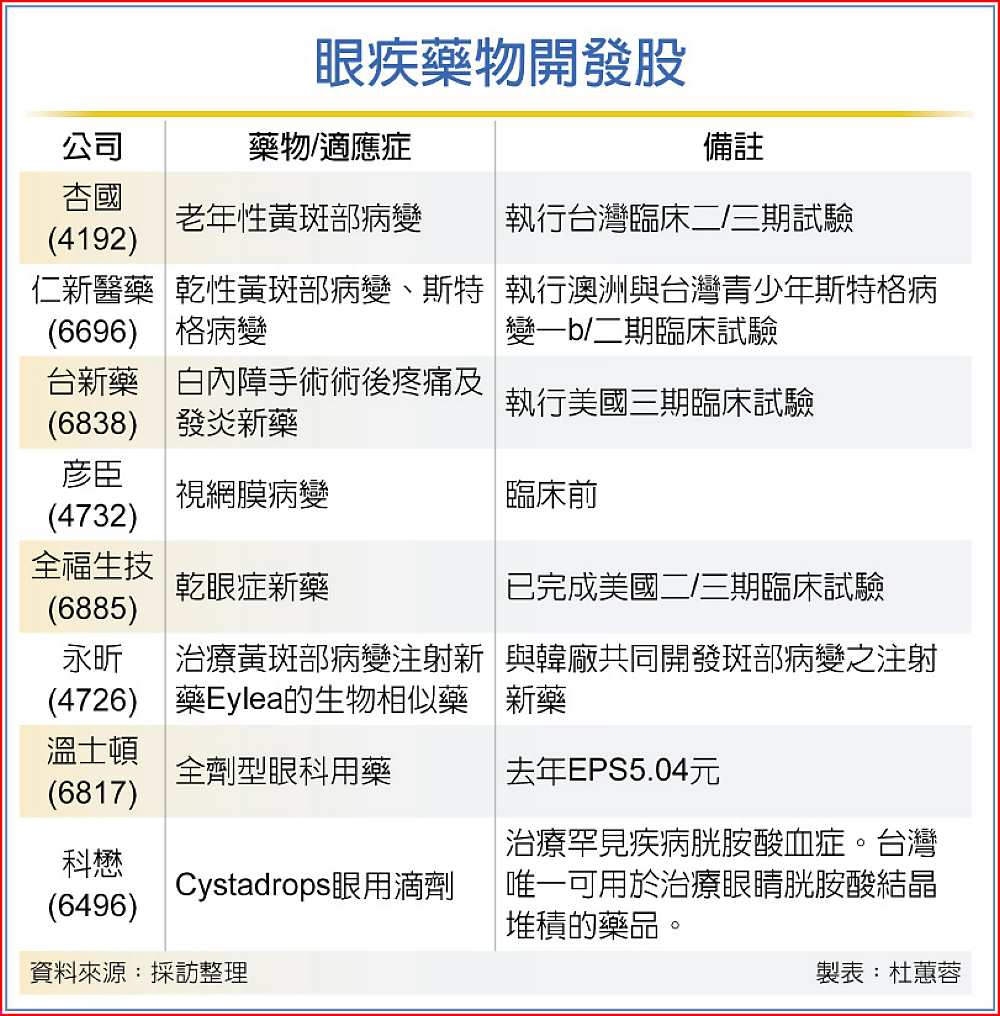 另外,為募集資金和尋找策略夥伴,仁新美國子公司擬申請海外上市掛牌,全福也可望在第二季登錄興櫃,都將助推國內眼疾藥物股打進國際賽局。