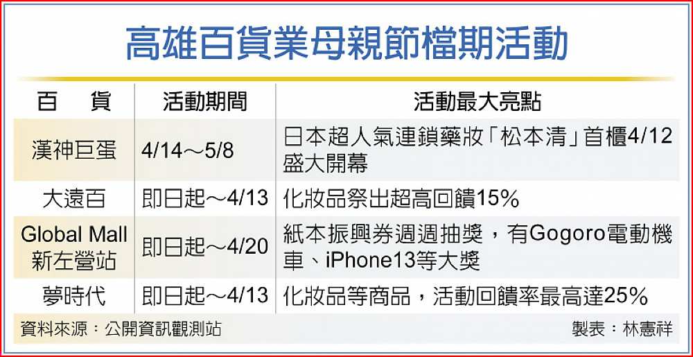 一年一度的母親節即將來臨,高雄百貨業包括漢神巨蛋、大遠百、Global Mall新左營站、夢時代的母親節檔期優惠大戰提前開打,紛祭出化妝品等商品15%~25%高回饋率、電動機車、智慧型手機等摸彩大獎來吸引人潮,希望能提升6%~10%的業績表現。