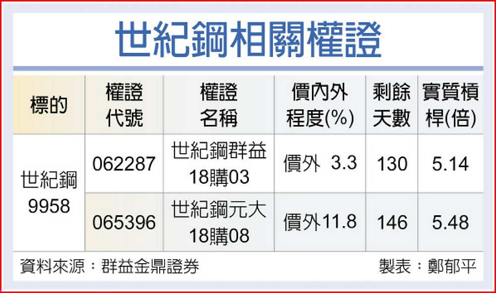 世紀鋼今年風電、鋼構事業兩得意,繼沃旭、哥本哈根基礎建設基金(CIP)等簽訂合約後,公司日前又奪下海龍離岸風電計畫,未來三至四年訂單無虞,公共工程、科技廠房也訂單滿手,鋼構在手工程金額逾35億元,訂單能見度已看至明年。*【權證投資必有風險,本專區資訊僅供參考,並不構成邀約、招攬或其他任何建議與推薦,請讀者審慎為之】