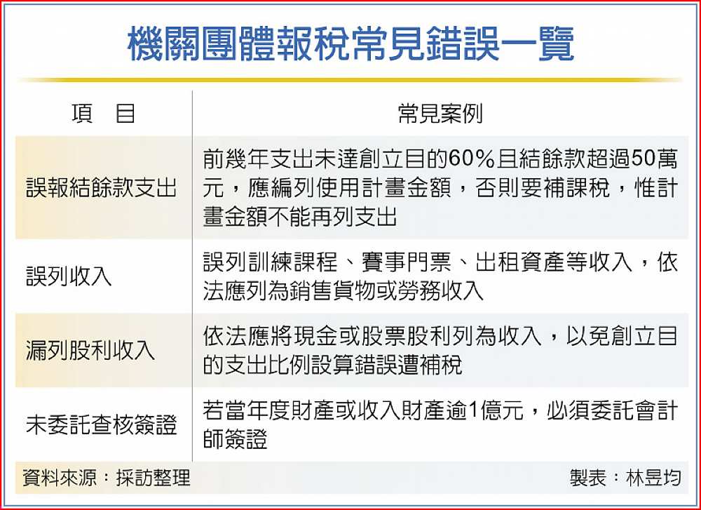 此外,官員也表示,若機關團體財產總額或當年度收入總額達1億元以上,其本身及附屬作業組織所得,應委託經財政部核准為稅務代理人的會計師查核簽證申報。