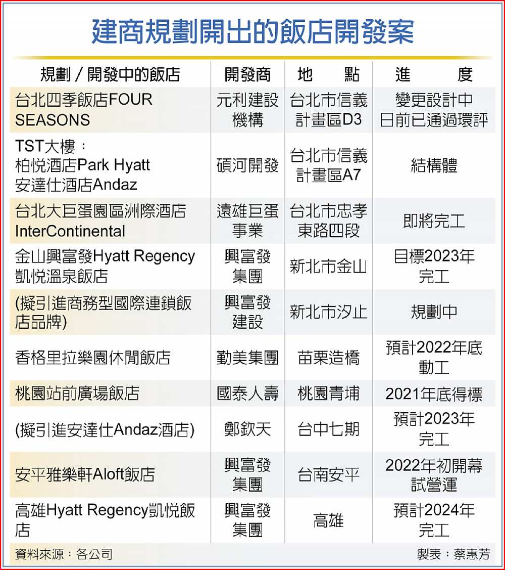 另外,集團總裁鄭欽天個人持有的台中七期飯店預定地,合作對象將由凱悅飯店集團旗下精品酒店品牌Andaz安達仕進駐,預計興建為地上29樓、地下7層的地標建築,約250間客房的豪華酒店,將於2023年完工。