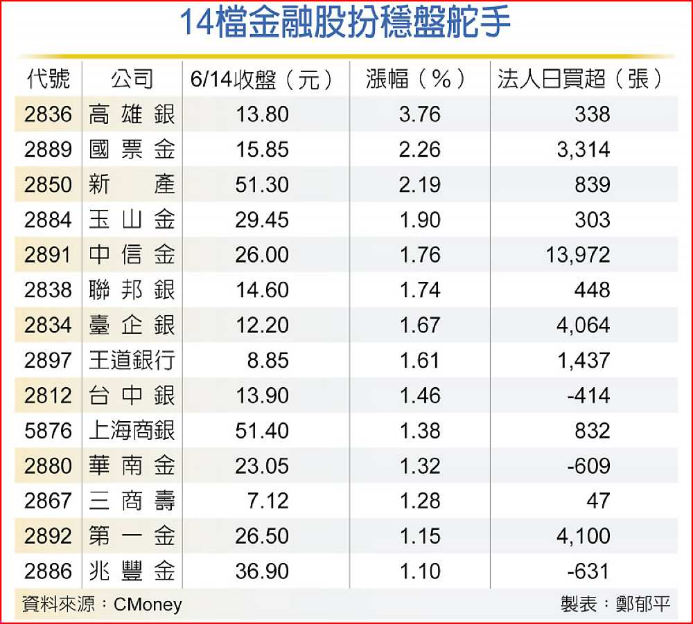 金控股國票金、玉山金、中信金、華南金、第一金、兆豐金14日逆勢上漲1~3%,法人連七買國票金8,862張,中信金也獲法人轉買1.4萬張;銀行股則由高雄銀扮演領頭羊,股價勁揚3.76%,漲幅創近三個月新高,聯邦銀、臺企銀、王道銀行、台中銀、上海商銀也漲逾1%,臺企銀笑納4,064張法人買盤加持。
