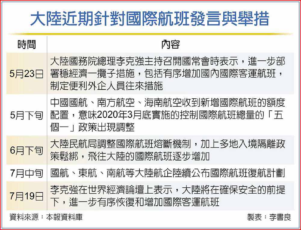 在各國陸續開放邊境,以及大陸經濟商貿處於低迷下,大陸近期開始調整新冠疫情爆發初期管控國際航班總量的「五個一」政策。大陸國務院總理李克強19日表示,將在確保安全的前提下,進一步有序恢復和增加國際客運航班。